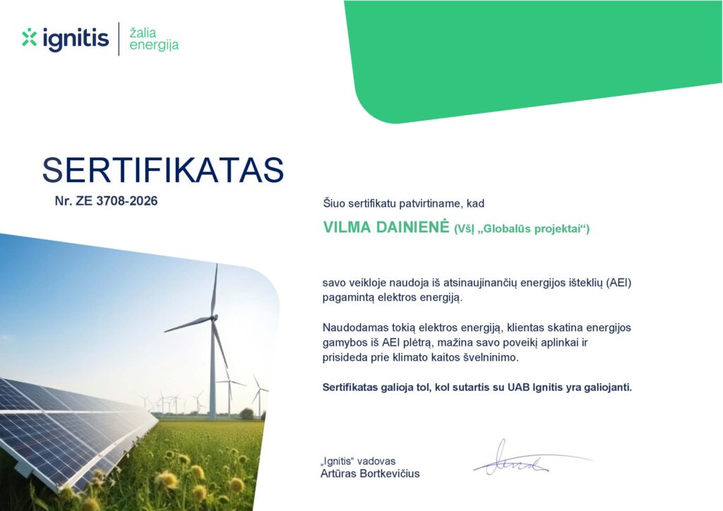 VšĮ „Globalūs projektai“ renkasi elektros energiją iš atsinaujinančių išteklių. Tai svarbus žingsnis siekiant mažinti poveikį aplinkai ir prisidėti prie švaresnės ateities kūrimo.